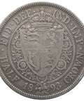 Reverse: crowned spade-shaped shield quartered with arms of England, Scotland and Ireland surrounded by the Collar of the Garter, around above, FID. DEF. IND. IMP., around below, HALF 1893 CROWN.