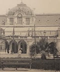 This charming postcard depicts the historic Le Casino and its surrounding gardens in Nice, France. A tranquil scene of palm trees, gas lamps, and well-manicured landscaping highlights the elegance of the Belle Époque era. Le Casino, a central hub of sophistication and entertainment, was a symbol of Nice’s status as a premier destination on the French Riviera.