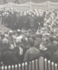 This postcard depicts a funeral ceremony held at the Kriegsgefangenenlager (POW Camp) in Hameln, Germany, during World War I. The image shows a large gathering of prisoners and guards around a grave in a forested area. The solemn crowd includes many uniformed men, standing in respectful silence as priests conduct the burial service. The scene is enclosed by a simple wooden fence, with a forest forming the background.