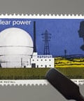 This is a 1966 British postage stamp featuring the silhouette of Queen Elizabeth II and an illustration of the Windscale Advanced Gas-Cooled Reactor, a significant technological achievement in nuclear power. The stamp was issued as part of a series celebrating British advancements in science and engineering. The stamp has a value of 1 shilling and 6 pence (1/6) and was printed by Harrison and Sons Ltd. Its bold design showcases the reactor and its role in pioneering nuclear energy development.