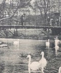 This postcard features a serene view of a partie an der Alster (section of the Alster) in Hamburg, Germany. The tranquil waters are dotted with swans, a timeless symbol of the city's natural charm. A small bridge, surrounded by lush trees, connects paths frequented by locals and visitors, while elegant buildings in the background reflect Hamburg's urban sophistication.