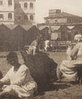 This postcard captures a nostalgic scene of the beach and huts (spiaggia e capanni) in Rimini, Italy. Families and beachgoers relax on the sand near traditional seaside cabins, a hallmark of early 20th-century Italian coastal culture.