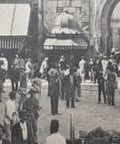 The bustling crowd and shops, including the notable Grand Café de la Place, reflect the commercial activity surrounding this gateway, which has been a central meeting point for locals and visitors alike.