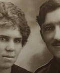 This postcard features a World War I British soldier and his wife in a formal portrait. The soldier is dressed in his British military uniform, standing beside his wife, who wears a dark dress adorned with a brooch and necklace. The couple appears close and composed, capturing a tender moment, likely taken as a keepsake before the soldier's deployment or during a short leave. The soft studio backdrop with floral accents adds an intimate and timeless quality to the image.