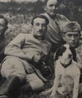 This postcard captures a group of six French soldiers from World War I, relaxing together in a forested area. The soldiers are lounging on the grass in their uniforms, taking a break from their duties. At the center of the group is a dog, sitting proudly with the men. Their relaxed posture and the natural, peaceful setting contrast with the harsh realities of war, offering a glimpse of camaraderie and downtime amidst conflict.