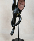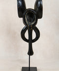 Similar to many of the other masks, this Guro mask represents the specter of Gu, the supernatural being's wife. The horns on each mask are meant to symbolize the spiritual power and are believed to have magical properties that will protect the owner and the communities human way of life. The Guro mask is one of a kind because it features a blend of human, animal, and fantastical elements. Various birds, including the horn bill and other large billed birds, are frequently carved into the mask. Nowadays, the people of Ivory Coast still use traditional dance to pay homage to their forebears and celebrate cultural events like funerals, and weddings, and the mask serves as a symbol of the people's dedication to the past