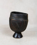 The cup features a robust, rounded body supported by a tapered pedestal base, a silhouette that is both stable and elegant. The exterior is adorned with intricate geometric engravings that reflect the rich decorative traditions of the Ethiopian highlands.