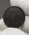 Vorderseite: Der norwegische Löwe im Schild und darüber die Krone. Schild teilt Monogramm