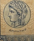 Vorderseite: Büste der Demeter, der antiken griechischen Göttin der Ernte und der Landwirtschaft, in einem verzierten Rahmen und mit komplizierten Hintergrundmustern.