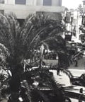 Diese Postkarte zeigt eine historische Ansicht von Meadan el Shuhadat in Tripolis, Libyen, mit palmengesäumten Straßen und Architektur aus der Mitte des 20. Jahrhunderts.