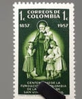 Diese kolumbianische Briefmarke aus dem Jahr 1957 erinnert an den 100. Jahrestag (1857–1957) der Gründung der Gesellschaft des Heiligen Vinzenz von Paul in Kolumbien. Das Design zeigt eine Abbildung des Heiligen Vinzenz von Paul umgeben von Kindern, was seine karitative Arbeit und sein Engagement für die Armen und Verletzlichen symbolisiert. Die Briefmarke ist überwiegend grün, hat einen Nennwert von 1 Centavo (1c) und trägt die Aufschrift „CORREOS DE COLOMBIA“.