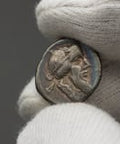 Vorderseite: Männerkopf nach rechts mit langem spitzen Bart und Haaren, die mit einem geflügelten Diadem zusammengebunden sind.