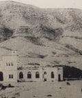 Diese alte Postkarte zeigt die „Thermes d'Hammam-Salahin“ in der Nähe von Biskra, Algerien, einen historischen Thermalquellenkomplex vor einer dramatischen Wüstenlandschaft.