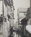 Auf dieser Postkarte ist die schmale Rue de la Boucherie in Caudebec-en-Caux zu sehen, die von jahrhundertealten Fachwerkhäusern gesäumt ist, die gefährlich über einen kleinen Kanal ragen.