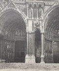 Diese Postkarte zeigt das Südportal der Kathedrale von Chartres, ein architektonisches Meisterwerk aus dem 13. Jahrhundert. Die aufwendigen gotischen Schnitzereien, die die drei Bögen schmücken, zeigen biblische Erzählungen, Heilige und symbolische Figuren und betonen die spirituelle und künstlerische Bedeutung der Kathedrale.