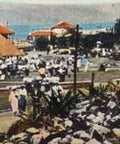 Diese Postkarte zeigt eine lebendige Szene am Ocean Beach in Durban, Südafrika, und fängt die geschäftige Atmosphäre am Meer des frühen 20. Jahrhunderts ein. Das Bild zeigt die beliebte Strandpromenade, auf der Besucher faulenzen, spazieren gehen und die malerische Aussicht auf die Küste genießen. Der zentrale Pavillon, umgeben von gepflegten Rasenflächen und strohgedeckten Pavillons, zeigt den Charme der Erholungsgebiete Durbans in dieser Zeit.