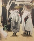 Diese lebendige Postkarte zeigt die Grande Rue du Talaa, eine belebte Straße in der Medina von Fes, Marokko, die zur beeindruckenden Moschee von Sidi Ahmed Tijani führt.