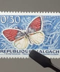 Madagaskar-Briefmarke 1960 0,3 Französischer Afrikanischer CFA-Franc Schmetterlinge mit violetter Spitze (Colotis zoe).