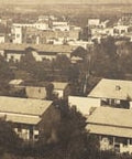 Diese Postkarte zeigt einen Panoramablick auf die Ville Nouvelle (Neustadt) und das Bahnhofsviertel in Meknès, Marokko. Die Szene hebt die Architektur der Kolonialzeit und den strukturierten Grundriss der Stadt hervor, umgeben von üppigem Grün und Bergen in der Ferne, was die Mischung aus Modernität und Natur der Stadt veranschaulicht.
