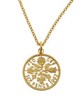 The coin has been cut out by hand using a jewellers saw. A link has then been silver soldered to the top of a coin. The pendant is polished and then gold/silver plated.