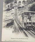 Diese Postkarte zeigt den steilen Aufstieg des Chemin de fer de Territet-Glion, einer malerischen Standseilbahn, die durch terrassierte Hügel nach Glion führt, das hoch über dem Genfersee liegt.