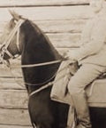 Auf dieser Postkarte ist ein deutscher Soldat aus dem Ersten Weltkrieg abgebildet, der auf einem Pferd vor einem Blockhaus sitzt.