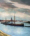 Beautiful painting of boats on a river with a view of a city in the background (which one?); oil on canvas, 60x80 cm. (painting), signed lower right. Overall in good condition, though there is a crack and the stretcher frame presses on the canvas at the top and bottom (see photos). Could also be cleaned; in short, some work to be done, but given the quality it’s certainly worth it!
