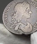 Vorderseite: Erster Lorbeerkranz und drapierte Büste von König Karl II. rechts, umlaufende Legende.