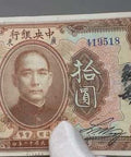 Obverse: Portrait of Dr. Sun Yat-sen (1866–1925), founding father of the Republic of China, at center within an ornate frame. Surrounding guilloche patterns in multicolor. Denomination “拾圓” (Ten Dollars) appears in Chinese characters on both sides. Serial number printed twice. Issued by “中國銀行” (The Central Bank of China).