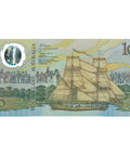 Obverse: Features an engraved vignette of the HMS Supply, the First Fleet ship that brought settlers to Australia in 1788, with groups of settlers and convicts depicted in the background. A transparent window with a holographic portrait of Captain James Cook is embedded at left. Denomination “10” appears at corners with the text “TEN DOLLARS AUSTRALIA.” Signatures of the Secretary to the Treasury and the Governor of the Reserve Bank of Australia are printed above.