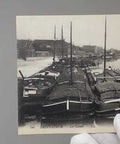 This postcard captures a tranquil scene along the canal in Saint-Omer, lined with sturdy commercial barges moored side by side.
