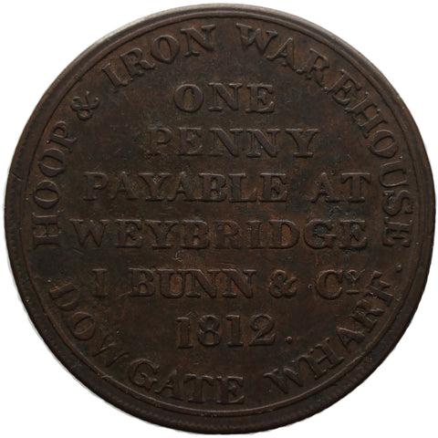 Rückseitenaufschrift: ONE PENNY PAYABLE AT WAREHOUSE. I.BUNN & CO. 1812. HOOP & IRON WAREHOUSE, DOWGATE WHARF