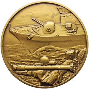 Vorderseite: Die Medaille zeigt ein detailliertes Bild eines Militärtransportflugzeugs im Flug. Im Vordergrund ist ein Soldat zu sehen, der mit einem Raketenwerfer auf dem Boden liegt und einsatzbereit ist.