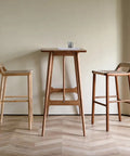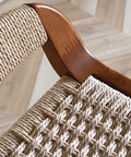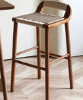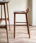 This bar stool embodies traditional Japanese minimalist design with a focus on natural materials and craftsmanship. Made from solid ash wood with a warm walnut finish, it features a handwoven seat crafted from durable kraft paper rope for a soft yet supportive feel. The clean lines and curved backrest reflect the harmony and balance typical of Japanese aesthetics.