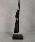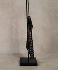 - Primitive Aesthetic: The piece features a set of tiered, conical wooden "clappers" that create a distinctive, hollow rhythmic sound when moved.