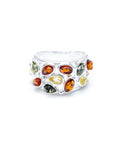 A chunky Sterling Silver Cuff Ring, featuring an openwork floral band, dotted with radiant, colourful, oval Ambers. A colourful jewellery box must have.