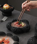 Introducing the Kubalo Tableware Collection – a striking ensemble that transforms the dining experience into an avant-garde display. Crafted from premium materials, each piece showcases a unique volcanic texture in an elegant black finish. The collection includes an innovative cloche that, when lifted, reveals a mystifying swirl of aromatic smoke once water is added, enhancing the visual and sensory delight of your culinary creations.