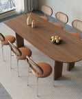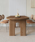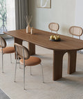 The Uta dining table anchors any dining area with its robust, dark-hued form and gracefully curved arches that serve as its base. This piece merges timeless design with contemporary lines, offering a spacious tabletop that invites family and friends to come together in style. A celebration of form and functionality, the Uta table is set to become the heart of your dining room's convivial moments.