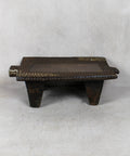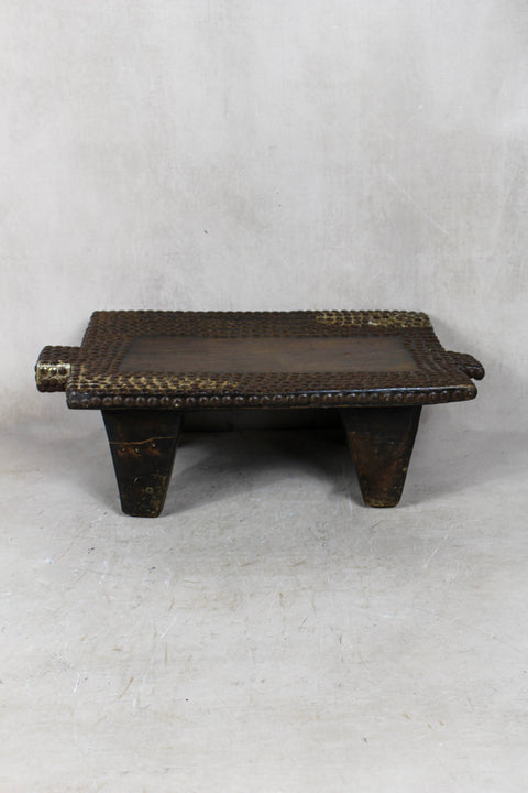This carved vintage stool is a stunning piece of traditional African craftsmanship. Hand-carved from solid wood, it features intricate patterns and smooth contours, reflecting the cultural artistry of its origins. The stool's rich, natural patina has developed over time, enhancing its vintage appeal. Its sturdy yet elegant design makes it a versatile accent, perfect for adding a touch of history and character to any space. Whether used as seating, a side table, or a decorative object, this stool is a unique and timeless addition to any interior. Embellished with metal add to its distinct design.