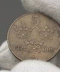 Avers : Le double monogramme couronné du roi Gustaf V de Suède divise la date. La devise du roi