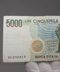 Inscription avers : 5000 LIRE CINQUEMILA PAGABILI A VISTA AL PORTATORE OFFICINA DELLA BANCA D'ITALIA IL GOVERNATORE (signature) IL CASSIERE (signature) V.BELLINI G.SAVINI INV.-T.CIONINI INC. BANCA D'ITALIA