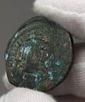 Avers : Buste d'Héraclius de face, barbu, cuirassé, coiffé d'un casque à plumes et de pendilia, tenant un globe cruciger dans la main droite et un bouclier avec cavalier sur l'épaule gauche.