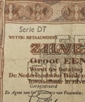 Avers : porte au centre l'étiquette « Zilverbon » (certificat d'argent), indiquant que ce billet peut être échangé contre de l'argent. À gauche, un cadre hexagonal avec un portrait de la reine Wilhelmine. Le texte autour de l'étiquette principale détaille la validité du billet et les instructions d'échange. Le numéro de série et la valeur nominale « 1- » sont imprimés dans chaque coin. Ce billet a été émis par le Royaume des Pays-Bas.