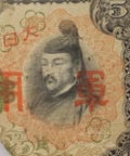 Avers : présente le portrait d'un personnage historique japonais de premier plan, vêtu d'une tenue traditionnelle, reflétant l'héritage culturel du Japon. L'arrière-plan comprend une scène de temple japonais, entourée de motifs floraux complexes. Au centre supérieur se trouve le blason du chrysanthème impérial, symbolisant la famille impériale du Japon. De grands caractères rouges surimprimés, « 軍用手票 » (Gun'yō Shuhyō), indiquent la « monnaie militaire », marquant son utilisation à des fins militaires dans les territoires occupés.