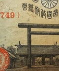 Avers : Le billet présente une représentation du portail Torii du sanctuaire Yasukuni au centre, symbolisant une entrée sacrée. Un aigle est représenté en vol dans le coin supérieur droit, entouré de fleurs de cerisier. La valeur «五拾銭» (50 Sen) est imprimée sur le côté droit en gros caractères, et le numéro de série « 749 » est affiché en rouge. Le billet comprend également un emblème de chrysanthème, symbole de la famille impériale, en haut au centre.
