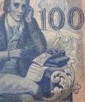 Avers : Portrait de Manuel Maria Barbosa du Bocage, célèbre poète portugais, assis à droite, l'air pensif, tenant une plume et du papier. Des motifs ornementaux entourent le portrait, reflétant l'importance culturelle de ses contributions littéraires. La valeur nominale « 100 » est affichée à gauche et à droite. Le numéro de série « CNQ 90284 » est imprimé à gauche.