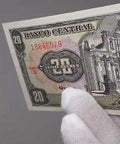 Reverse: Displays the coat of arms of Ecuador in the center, framed by elaborate guilloche patterns. The denomination "20" is shown in all four corners, and the text "BANCO CENTRAL DEL ECUADOR" and "VEINTE SUCRES" appear prominently.