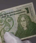 Obverse: Portrait of Lady Lavery, designed by Sir John Lavery, at right. Background filled with Gaelic script from the Book of Kells, along with intricate Celtic patterns. Denomination “£1” at lower left and top right. Serial number printed in red. Text: “banc ceannais na hÉireann” (Central Bank of Ireland).