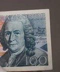 Obverse: Portrait of Carl Linnaeus (1707–1778), the famous Swedish botanist and zoologist, known as the “father of modern taxonomy.” Botanical illustrations including plants and diagrams are shown at left, with the Uppsala Botanical Garden plan in the background. Denomination “100” and text “ETT HUNDRA KRONOR” displayed prominently. Serial number printed at lower left. Issued by “SVERIGES RIKSBANK.”