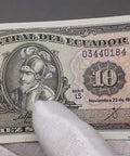 Reverse: Displays the coat of arms of Ecuador in the center, flanked by ornate designs. The denomination "10" is shown in each corner, with "DIEZ SUCRES" printed prominently at the bottom.